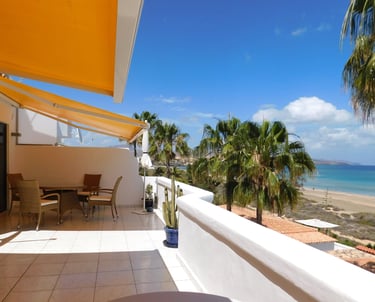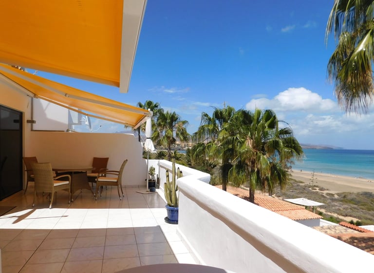 Genießen Sie den fantastischen Meerblick auf der großen, geschützten Terrasse. Verbringen Sie Ihren Urlaub in einem großzügigen, hellen Penthouse, nur wenige Meter zum weitläufigen Strand der Costa Calma. Vom Bett aus können Sie jeden Tag aufs Neue den faszinierenden Sonnenaufgang erleben und abends mit gutem Essen und einem Glas Wein bei Meeresrauschen in den klarem Sternenhimmel schauen und komplett entschleunigen. Über wenige Stufen gelangen Sie zum Strand, können noch vor dem Frühstück in den Ocean springen und ein paar Runden schwimmen. Das ist Erholung pur!