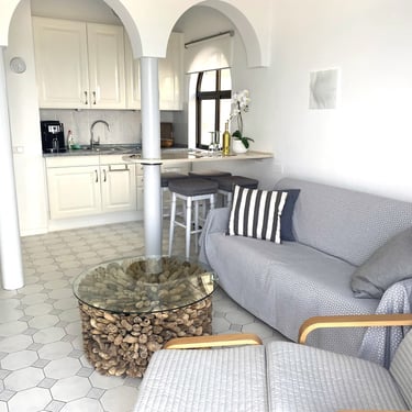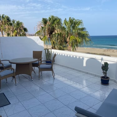 Das Penthouse befindet sich in einer ruhigen, am Hang gelegenen, privaten Wohnanlage, die über zwei eigene Strandzugänge verfügt. Die Anlage befindet sich in erster Strandlage, das Penthouse erhöht in 2ter Reihe. Trotz dieser einmaligen Strandlage befinden Sie sich zentral an der Costa Calma, so dass Sie in wenigen Minuten Supermärkte, Restaurants, Bars etc. erreichen können. Am Strand, vor der Anlage, ist eine schöne Strandbar, in der Sie von morgens bis abends Getränke oder kulinarische Kleinigkeiten zu sich nehmen können. Am Strand befinden sich ebenfalls Liegen und Sonnenschirme, die Sie gegen eine Gebühr nutzen können. Die Wohnung verfügt über ca. 50 qm Wohnfläche, mit schönen hohen Decken und einer qm knapp 30 qm großen Sonnenterrasse, 2 großen, elektrischen Markisen mit Fernbedienung und traumhaftem Meerblick. Sie hat einen gemütlichen Wohnbereich mit einer offenen Küche, die für Selbstversorger sehr gut ausgestattet ist und z.B. über einen DeLonghi Kaffeevollautomaten, Filterkaffeemaschine, Wasserkocher, Toaster, Kühlschrank verfügt. Im Wohnbereich steht Ihnen ein 55 Zoll OLED 4 K Smart TV, mit neuester Technologie zur Verfügung. Sie können hier viele deutsche Sender schauen oder einfach über Bluetooth ihre Lieblingsmusik abspielen. Im großzügigen Schlafzimmer stehen Ihnen ein gemütliches, großes Doppelbett und ein großer Schrank mit viel Staufläche zur Verfügung. Hier befindet sich ebenfalls ein 43 Zoll großer Fernseher, der dezent hinter den Vorhängen verborgen ist und bei Bedarf hervorgezogen werden kann. Von beiden Räumen haben Sie Strand- und Meerblick sowie direkten Zugang zur windgeschützten Sonnenterrasse. Das hochwertige Sofa im Wohnbereich kann mit wenigen Handgriffen ausgeklappt und als Schlafsofa für bis zu 2 Personen genutzt werden. Es gibt ein großes Bad und ein separates WC, beide durch die Fenster gut belüftet, freundlich und hell. Ideal ist der Aufenthalt als Paar (+) oder Single mit Lust auf Meer..